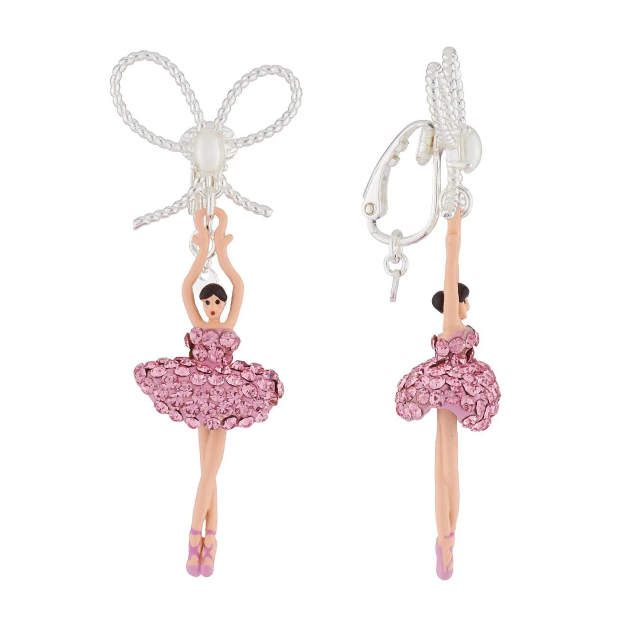 Introducing the Pas de Deux Lux Light Rose Earrings by Les Nereides. These exquisite earrings are inspired by the graceful ballerinas of the Opera de Paris. Crafted with attention to detail, they feature gold plated brass (18k), rhinestone, pearl, and hand painted enamel. The stud is made of surgical steel, ensuring comfort and durability. With a length of 5.5cm and a width of 2cm, these earrings are the perfect addition to any outfit. Please note that for hygiene reasons, stud, hook, and sleepers earrings cannot be exchanged or returned. Each piece of jewellery is sent in its Les Nereides packaging, reflecting the brand's commitment to quality and elegance. Elevate your style with the Pas de Deux Lux Light Rose Earrings from Les Nereides.