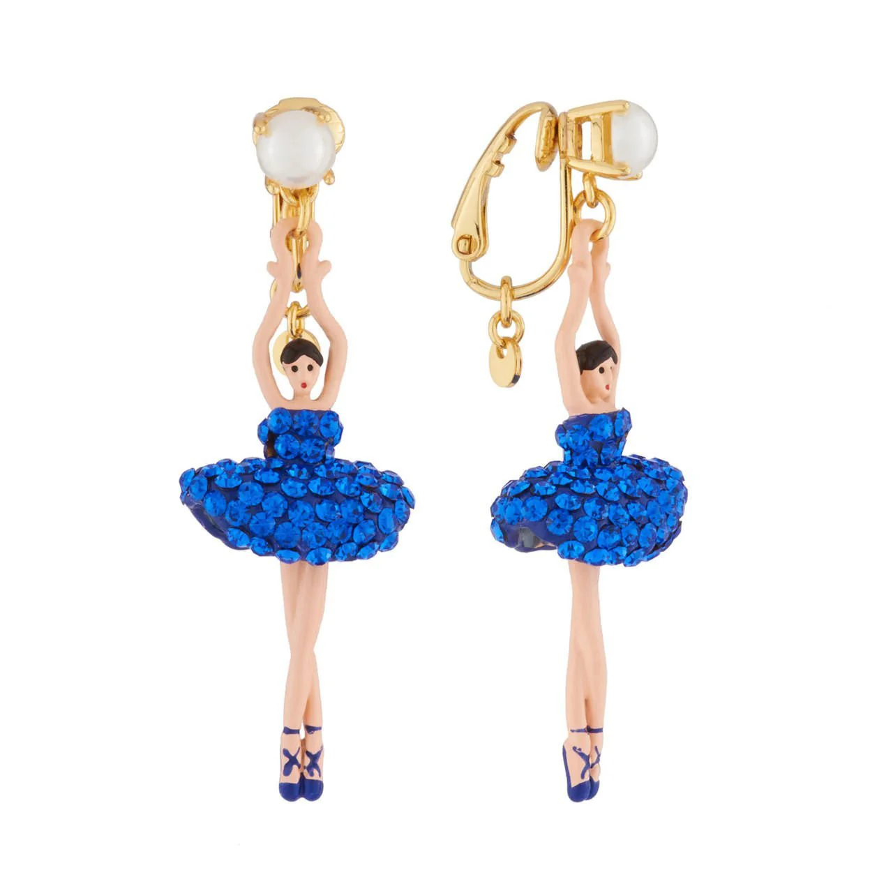 Introducing the Pas de Deux Lux Sapphire Earrings by Les Nereides. These exquisite earrings are inspired by the graceful ballerinas of the Opera de Paris. Crafted with attention to detail, they feature silver plated brass, rhinestone, pearl, and hand painted enamel. The stud is made of surgical steel, ensuring comfort and durability. Measuring 5.5cm in length and 2cm in width, these earrings are the perfect addition to any outfit. Please note that for hygiene reasons, stud, hook, and sleepers earrings cannot be exchanged or returned. Each piece of jewellery is sent in its Les Nereides packaging, reflecting the brand's commitment to quality and elegance. Elevate your style with the Pas de Deux Lux Sapphire Earrings from Les Nereides.
