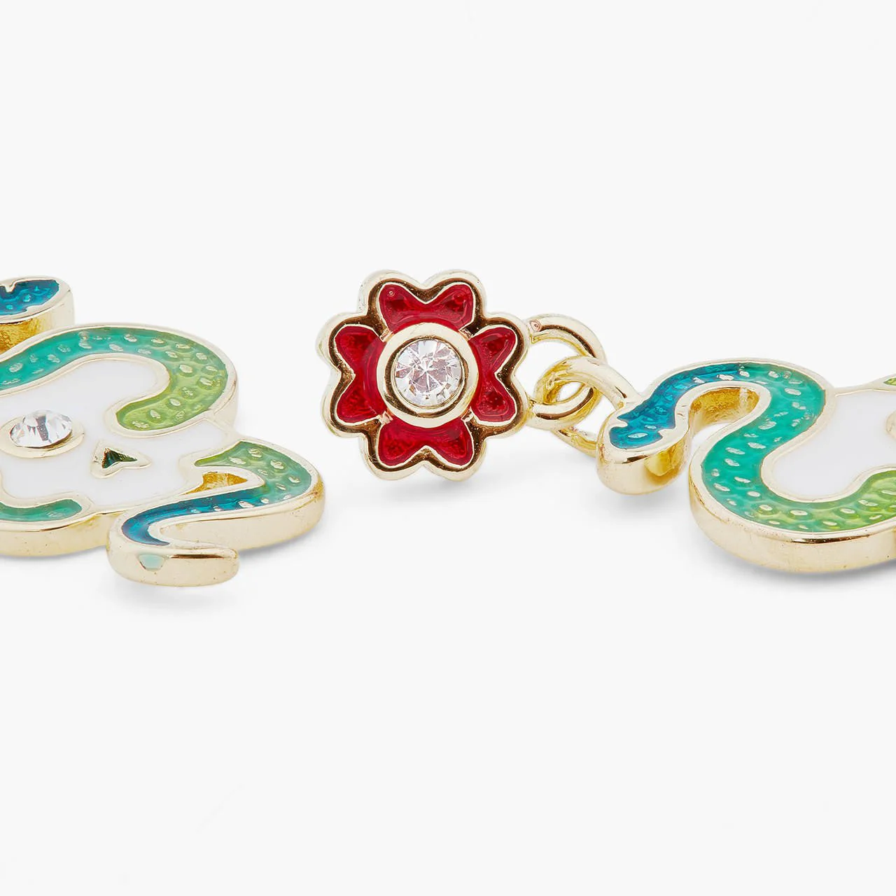 Let yourself be seduced by the Memento Mori earrings from the Art of Divination collection. This pair of costume jewellery earrings is composed of a flower with a crystal heart. A human skull wrapped in a green snake can be seen at the end of the earring. This pair is inspired by a card reading from the oracle. The skull and snake are two complementary elements representing the cycle of rebirth and death. For the complete set, you can match it with the Memento Mori necklace from the same collection. This set is for people who are interested in the world of magic and fortune-telling.