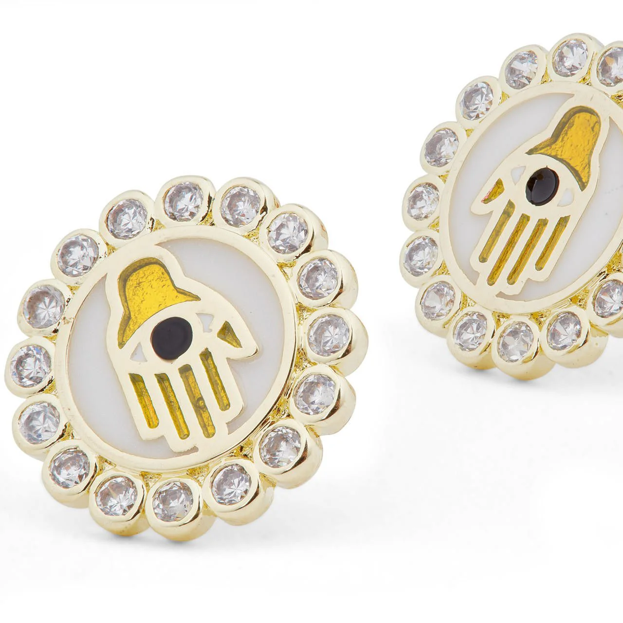 Introducing our stunning Hamsa Earrings, a luxurious and classic addition to any jewelry collection. These round earrings feature a beaded contour or small crystal embellishments, a signature model of the great Houses. Our reinterpretation of the Hamsa adds a touch of imperfect symmetry, with an evil eye in the center that stretches over the palm. The hand is turned upwards, symbolizing power, strength, and protection. Crafted from gold-plated brass and hand-enamelled, these earrings also feature faceted crystals for added elegance. Measuring 1.4cm in length and width, and weighing 4.2g, these earrings are a must-have. Please note that stud, hook, and sleeper earrings cannot be exchanged or returned for hygiene reasons. Shop now and add a touch of luxury to your wardrobe.
